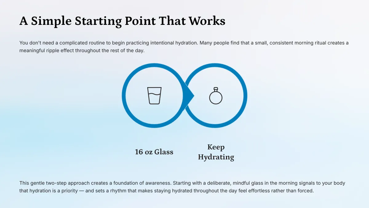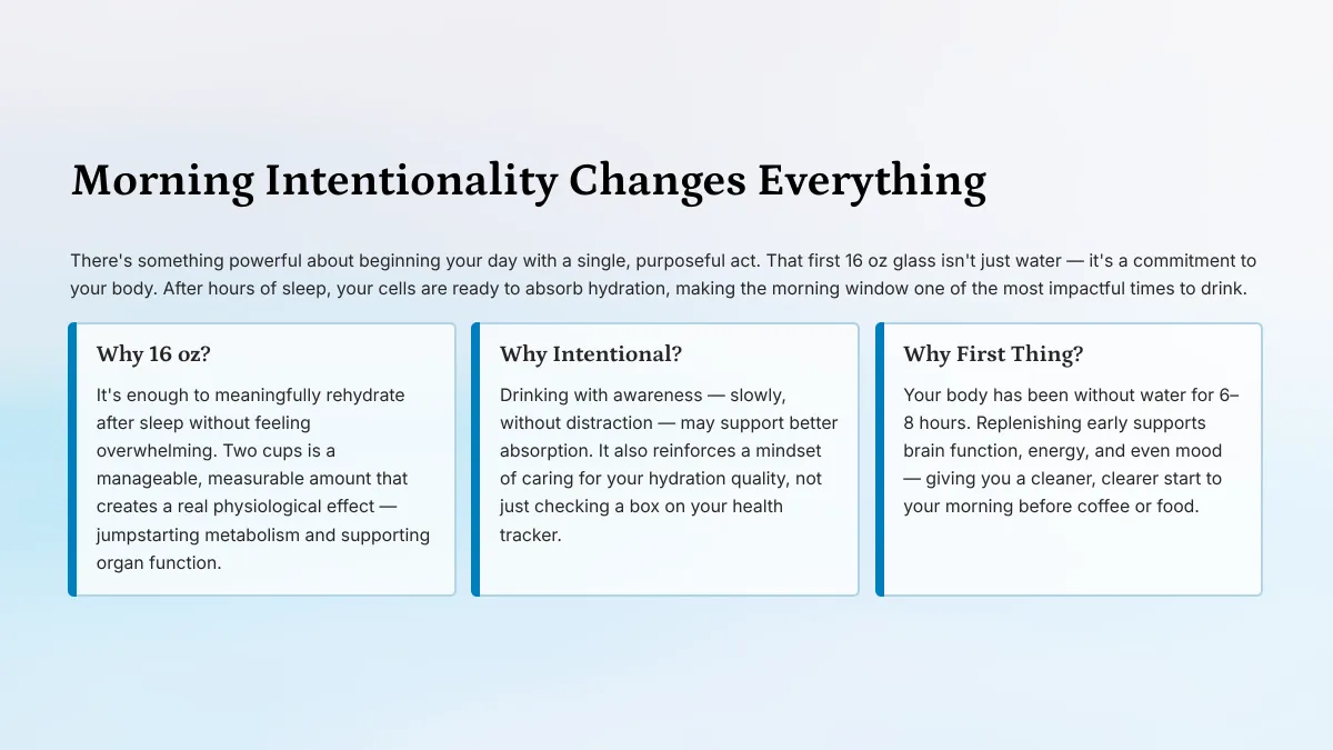 Some people like to start with one intentional 16 oz glass in the morning, then continue with regular water intake throughout the day based on their needs.